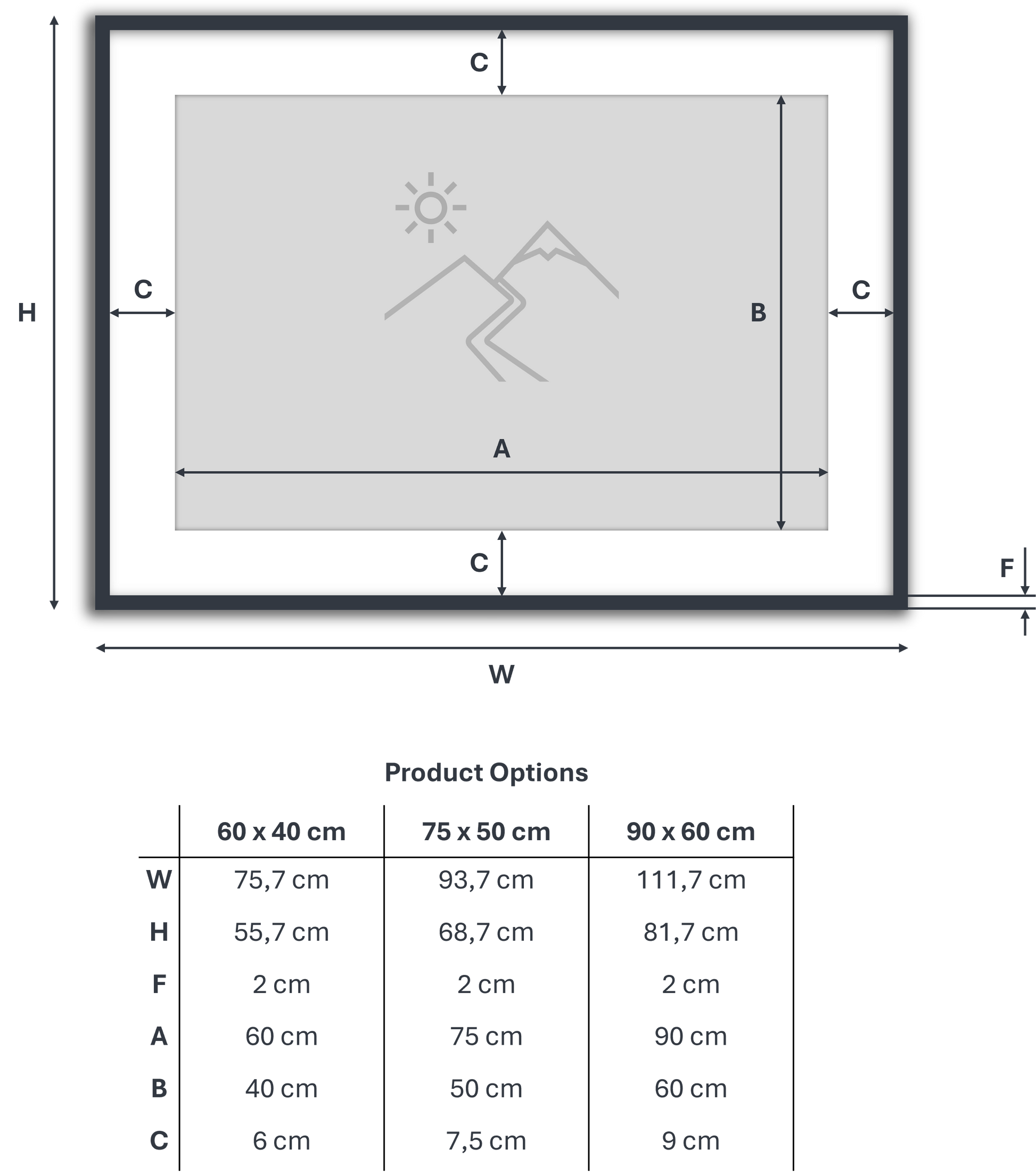 - The 60 × 40 cm option results in a total size of 75.7 × 55.7 cm.